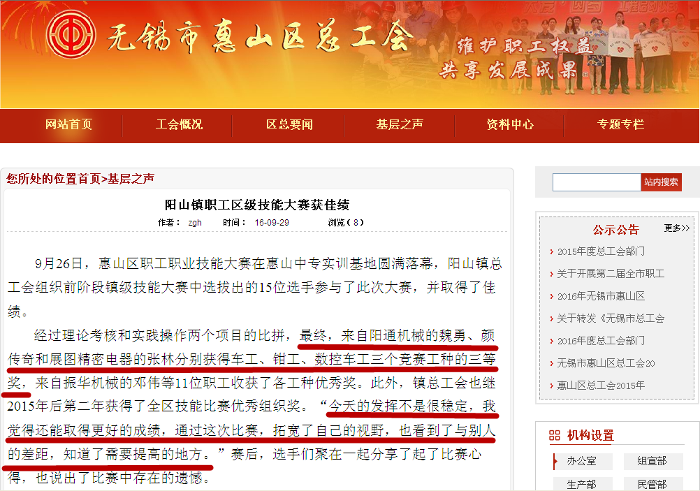 9月26日, 2016年惠山區(qū)職工職業(yè)技能大賽在惠山中等專業(yè)學(xué)校實(shí)訓(xùn)基地鳴鑼開賽; 這次比賽結(jié)束獲獎的顏傳奇、魏勇在“無錫市惠山區(qū)總工會”網(wǎng)站上刊登表揚(yáng)。如圖所示