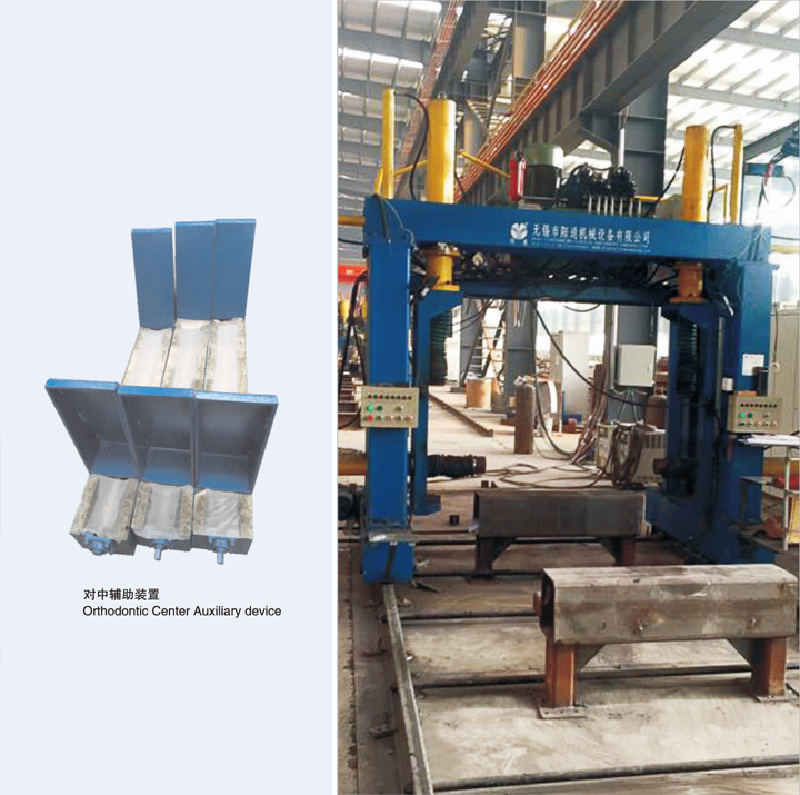 本機用于U型及箱型柱組裝,板材放在帶有輔助對中裝置的支架上,電機驅(qū)動行走門架,上、側(cè)壓缸壓緊工件的腹板和翼板組裝成型并點焊。